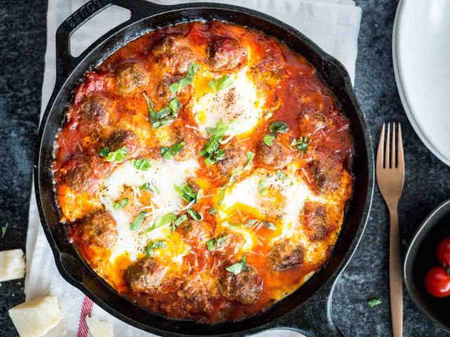 For the ultimate comfort food, try this egg and meatball dish from Plated Cravings. The meal comes together easily in a slow cooker. Simmered in a smooth marinara sauce, this high protein meal works for hungry hoards any time of day.