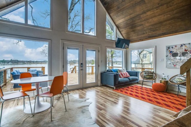 This lakefront cabin will quickly become your family's favorite vacation spot. Start your morning with a cup of coffee on the back deck overlooking Lake Lavon and then spend the day kayaking and paddle boarding (rental fee is extra) and then finish off the nights at the fire pit.