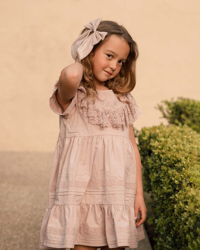 This darling pintuck and lace detailed dress comes in Mauve and Natural.