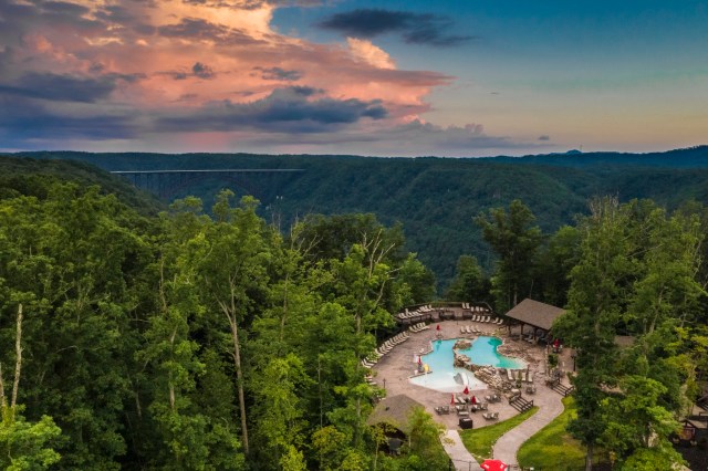 Right on the rim of New River Gorge and in the heart of the newest National Park, Canyon Falls Pool is the perfect place for your next family getaway. Whether splashing in the kiddie waterpark, admiring the ornate waterfalls, or sunbathing on the deck overlooking the gorge, your whole crew will be occupied for hours. You can choose from cabins, glamping tents and rental properties on-site. You can even try your hand at tent or RV camping during your visit.