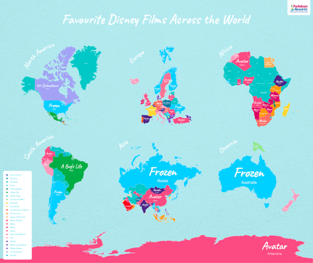 The company recently analyzed data gathered from Google to determine favorite Disney films across the world and the results are not as shocking as you might think. With an annual search volume of 1.9 million, Disney’s Frozen took home the prize for first place! But Parkdean Resorts didn’t stop there–it also created a fun map of the most popular film in each country!