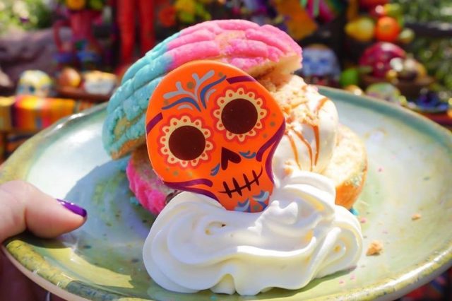 In honor of Dià de los Muertos, or the Day of the Dead, Disneyland has rolled out a delicious Pan Dulce Ice Cream Sandwich. Dulce de Leche ice cream is sandwiched inside a sugary, rainbow-colored Pan Dulce concha.