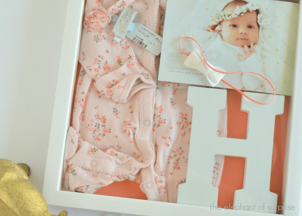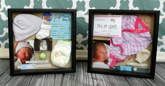First, decide what to display. You could include a sonogram, baby's first photo, hospital ID bracelet, hospital hat, first socks or booties, baby's going-home outfit, the first pacifier, birth announcement, tiny footprints, crib shoes, or a piece of a beloved swaddling blanket. We love what Alli from Taking Care of Monkey Business included in hers (see above).
