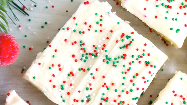 What's a better gift than Christmas cookies? A Christmas cookie cake bar! This holiday treat is sweetness at its sugary best. Get the step-by-step how-to from Bitz & Giggles.