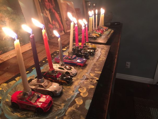 What you'll do: Have your kids pick out nine cars and paint or decorate a plank of wood however they wish. While the paint is drying, glue the hex nuts atop the cars as shown. For the shamash (middle) candle, use a taller car or glue two hex nuts atop so it stands higher than the others.