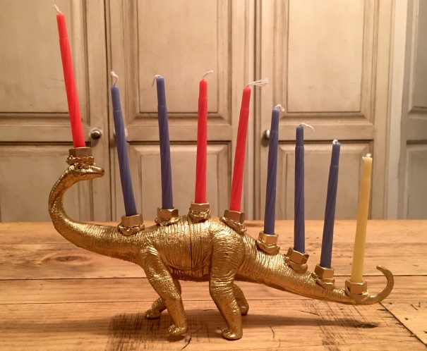 Good to know: This menorah doesn't leave much for the kids to do (hot glue guns and spray paint aren't exactly child-friendly), but your kiddos will love seeing their dinosaur transformed into an instant Hanukkah heirloom.