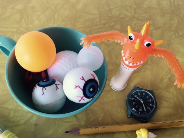 Filler. You are limited here only by your imagination and the size of the jar. Look for small toys, dice, dominos, pencils, broken watches, cool coins, earrings, broken hair clips, spools, old keys or similar items. Here’s your excuse to round up all the goody bag/vending machine toys and those game pieces you lost the rest of. Avoid anything too heavy (rocks) that could potentially break the jar if shaken.
