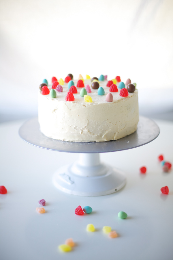 Sometimes basic is best when it comes to cake decorating! It doesn’t get much easier than this idea from Lyndsay Sung via You Are My Fave. Just buy a bunch of chocolates or gummies and pop them on the frosted cake. Click here to see two more simple ideas that look just as delicious.
