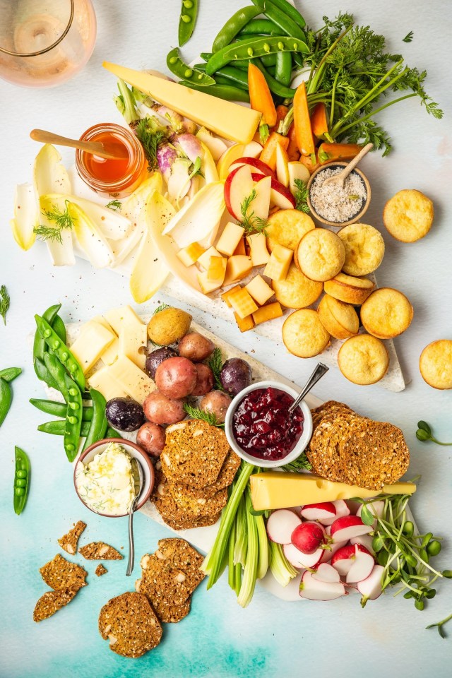 For something a little lighter, we love this veggie-forward board from Vegetarian Ventures. Think cheesy homemade popovers that are paired with piles of fresh veggies and sliced cheese.