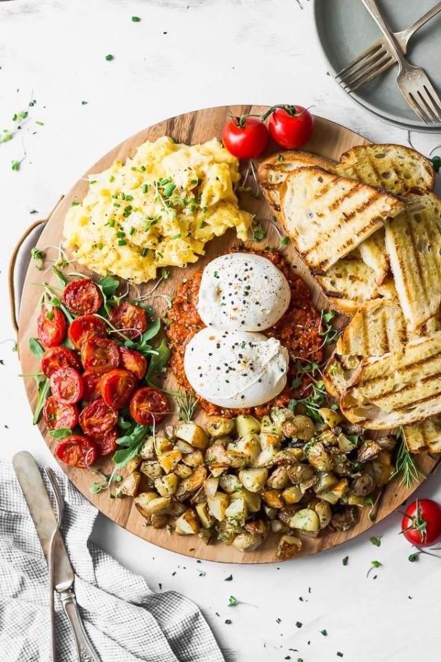 Burrata fans, you don’t want to miss this breakfast for dinner idea! The deliciously decadent cheese is the centerpiece of this board from Fork in the Kitchen, and it’s complemented by soft scrambled eggs, roasted tomatoes and garlicky potatoes.