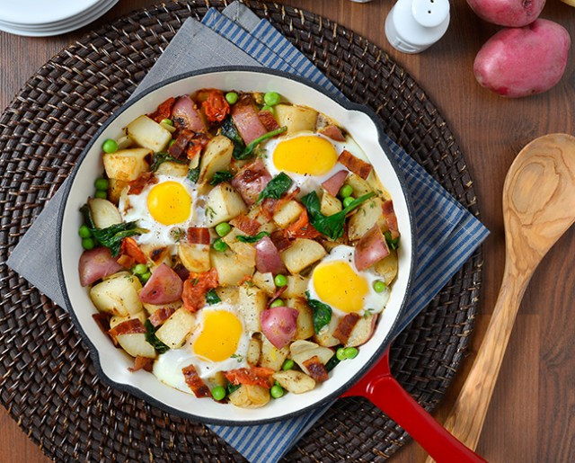 If Mom is hankering for something savory, chances are this skillet dish will hit the spot. It has bacon, potatoes and eggs, and you can even sneak in some spinach and peas for a complete and balanced meal. Here is the recipe.