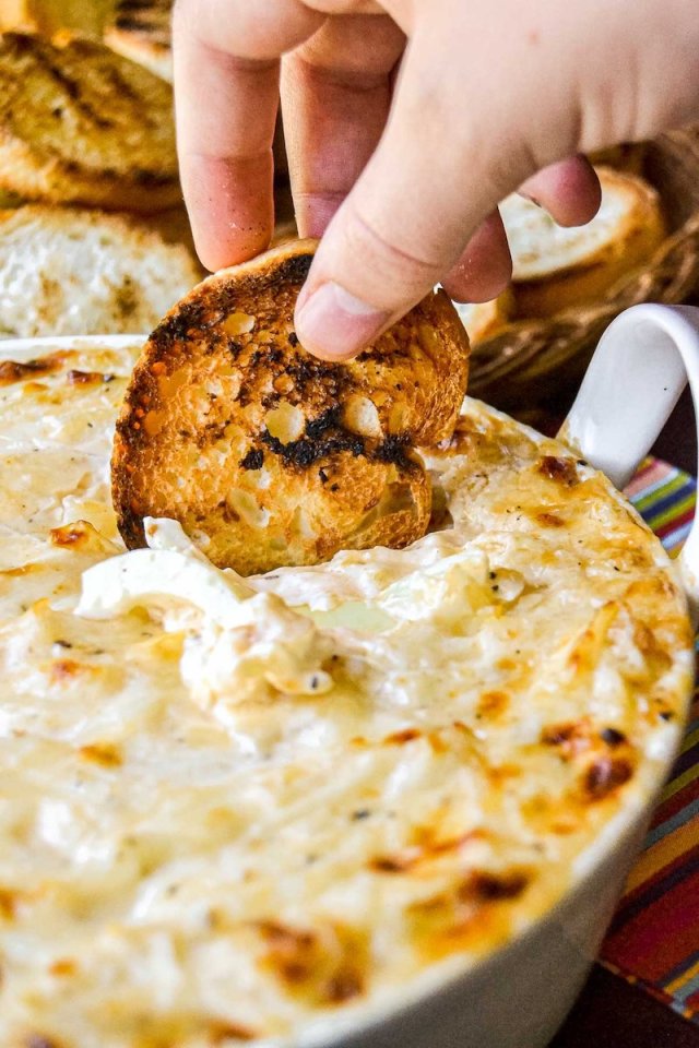 Creamy Hot Artichoke Dip Recipe with Garlic Toast Rounds