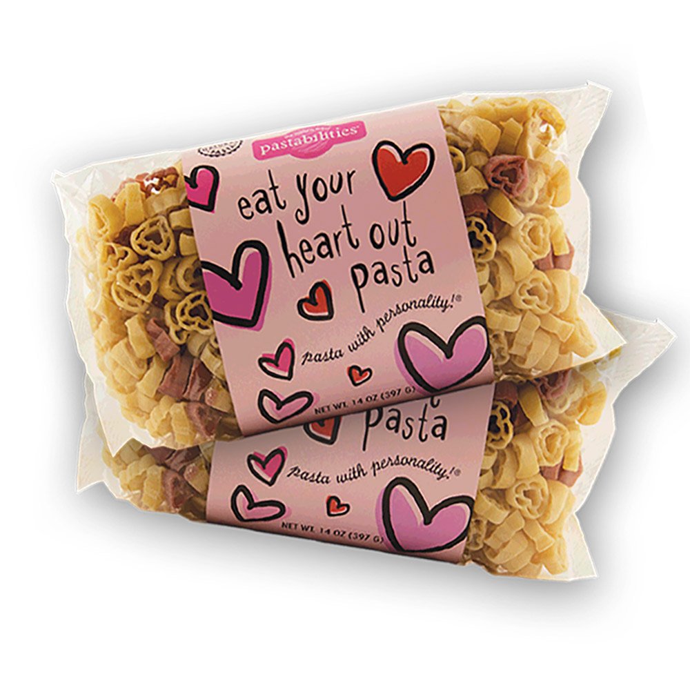Pastabilities Eat Your Heart Out Pasta sells, on Amazon, for $13. You’ll get two bags of the adorable heart-shaped naturally vegan pasta, made from 100 percent Durum wheat.