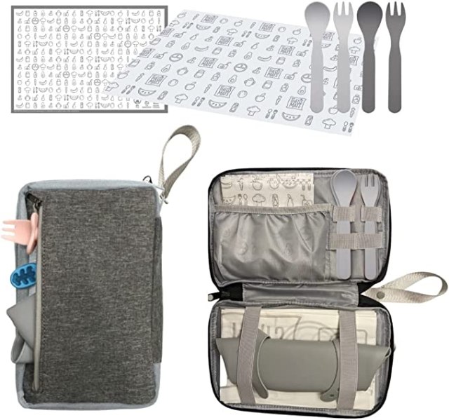 Eco-friendly baby-led weaning supplies include splat mats, placemats, utensils, and a mealtime clutch! It's all restaurant-ready and diaper bag-friendly, too.