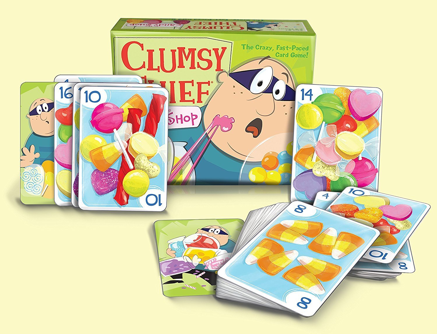 The follow-up game to award-winning Clumsy Thief, this time, the masked menace is at it again—in a candy shop! Using the stack of 94 cards, players try to add up enough candy to make 20. Thief cards steal candy cards, jail cards stop thieves. The player with the most cards at the end of the round wins!