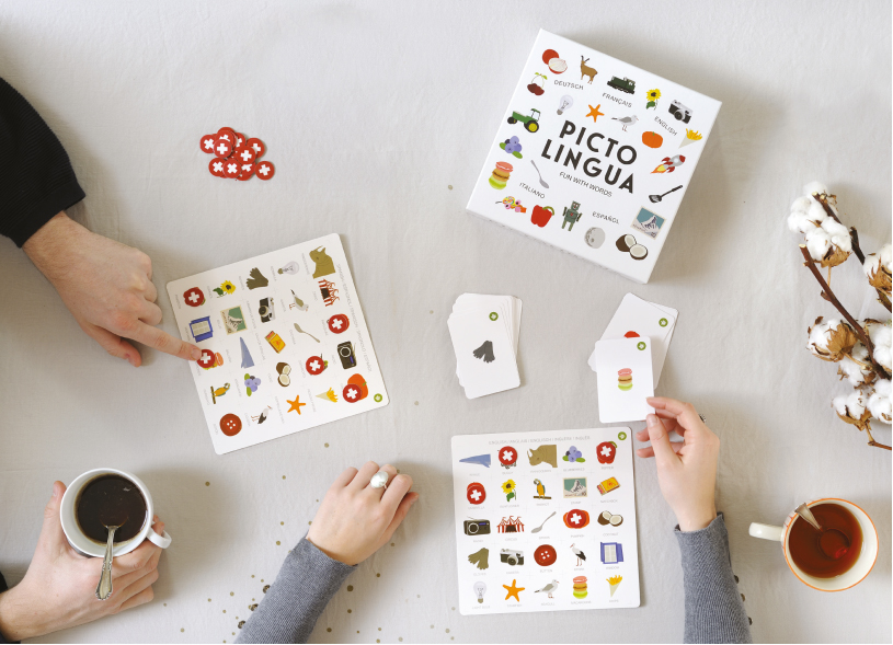 B-I-N-G-O! The delightful illustrations of Picto Lingua offer a visual twist on a classic family game. With nearly 50 words in five different languages—German, French, English, Italian and Spanish—players can use both words and pictures, or make the game even more challenging by flipping the playboard and trying to win with only the pictures! There are 50 flashcards, 10 play boards, and over 100 tokens.