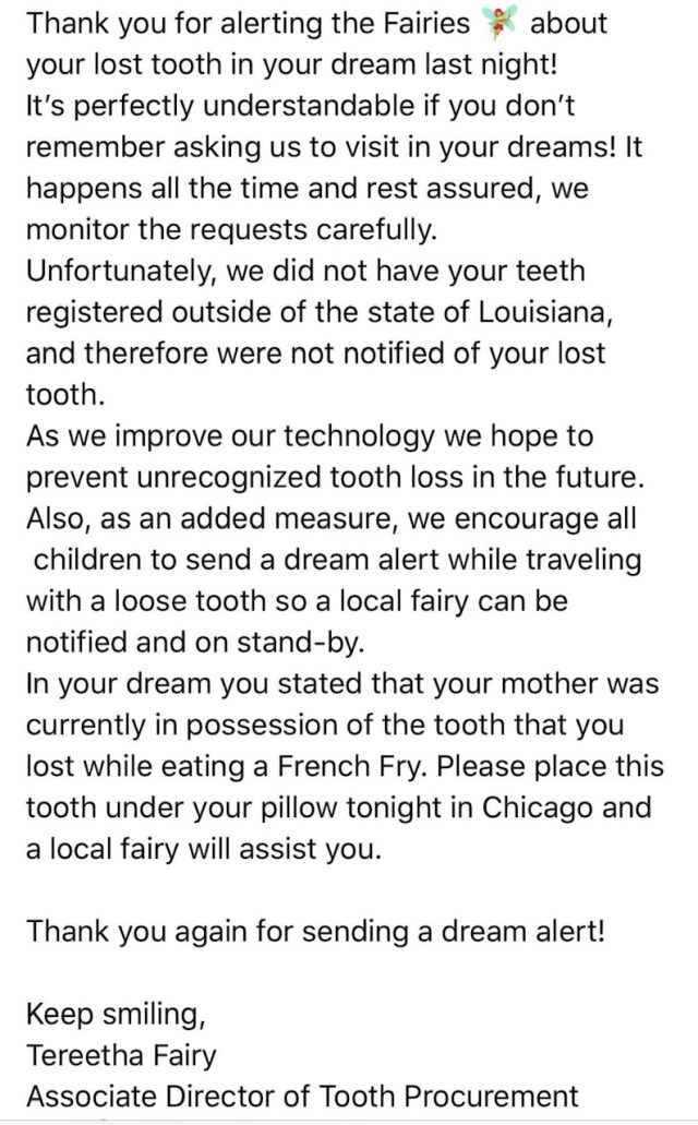 Our winner for "Best Tooth Fairy Excuse" goes to Renee from @fakeadultmom. When her daughter lost her tooth on vacation, and she couldn't sneak away from the hotel to grab cash, she set up an email account from "Tooth Fairy Corp" and sent the clever message you see here. Happy Tooth Fairying!