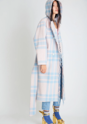 Chic for fall, this oversized trench-style jacket has an exaggerated, relaxed silhouette with a hood, double-breasted buttons down center front, a wide belt and twin patch pockets at front.