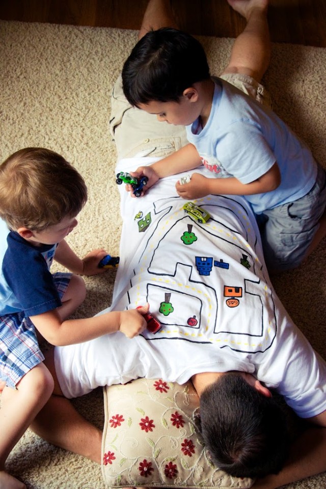 We’re pretty sure this racetrack t-shirt from The Winthrop Chronicles is pure genius. The kids get to play, and Dad gets a racecar massage. Plus, instead of a generic racetrack, you can add landmarks from your neighborhood or places that the kiddos like to go with Dad. Get the DIY details here.