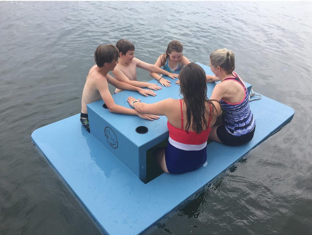 The floating table is 8 feet by 6 feet with a 600 pound capacity and can hold up to five adults. It features four cup holders and eye hooks so that you can attach a cooler and really never need to leave the water.