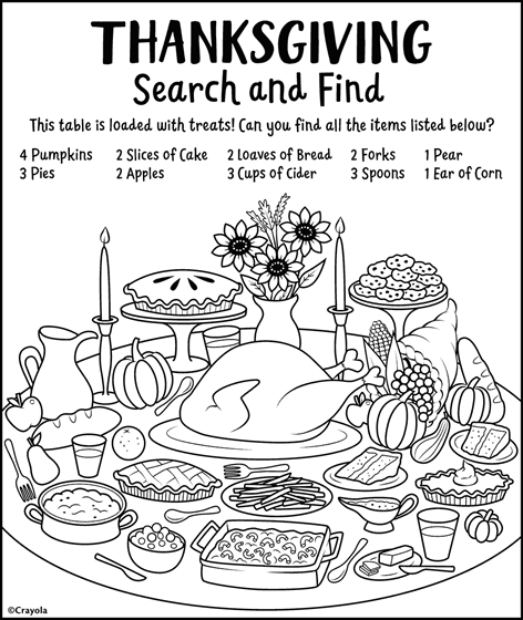 Crayola has a lot of fun Thanksgiving activity pages, but we especially love this search-and-find game. They can color while they look for hidden objects! Download it here