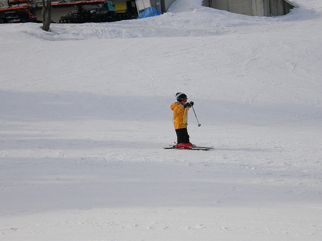 Have some fun inside first. No doubt about it, those stiff boots, clunky helmets, bug goggles, and giant boards attached to your feet can be scary business! Avoid the tears and let your little ones have some fun inside gearing up and sliding across the carpet with some help from mom or dad. Let them practice putting on and taking off the boots and be sure to demonstrate binding use. Our three year old felt much more comfortable once he realized the loud “click” of a binding did not mean the skis were now permanently attached to his feet.x