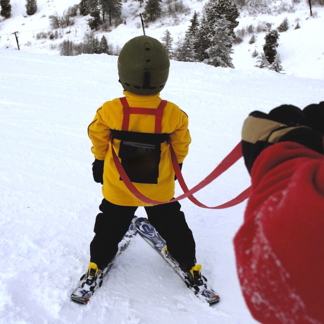Get your own gear ready. The most practical thing a parent skier should own is some kind of hydration backpack. Pack it with snacks, extra layers, extra gloves, and sunblock. The water is probably the most important item though, since a dehydrated kid is a cranky kid. If you are teaching your child to ski yourself there is a variety of gear that can help with this endeavor. We tried several of these contraptions, but the Lucky Bums Ski Trainer (pictured above) was by far the favorite. The grab handle on the back is perfect for loading kids on and off the chair lifts and it also has a handy self enclosed backpack to stash the straps.