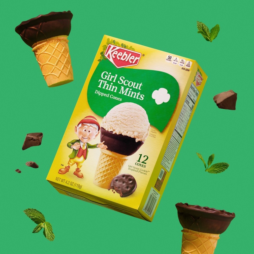 Keebler Girl Scout Thin Mints Dipped Cones have arrived! The brand’s first flavored fudge-dipped cones are made with custom dark chocolate and the exact same peppermint oil used in Girl Scout Thin Mints.