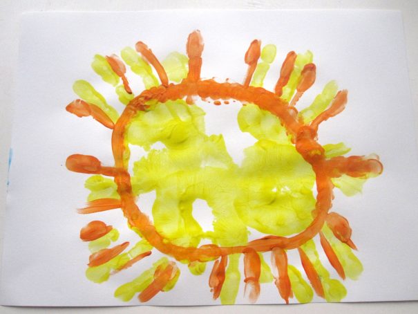 Paint your kids’ hands with the selected colors and have them make a print on each piece of paper. Colored paper is also an option if you want to use white paint (see January and October). Depending on your design, you may need just one handprint, a fingerprint, or even a footprint. Be sure to wash and dry your hands between each month, and continue through the year, from January to December. If you think it doesn’t look like much, don’t worry! After each month has dried, and you add the details, it’ll look awesome.