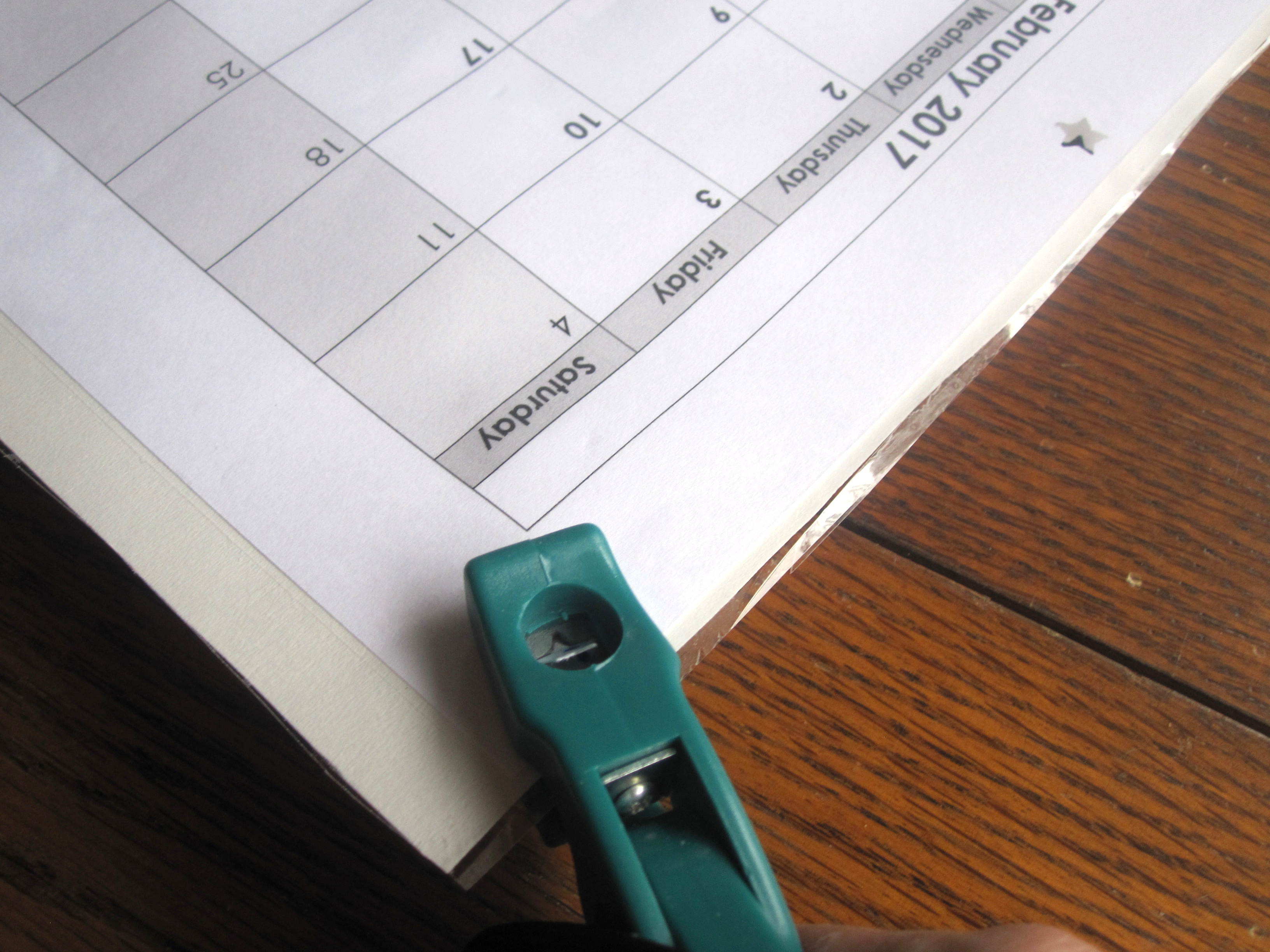Using a hole punch, make three holes at the top of each page (the calendar month should have the holes at the top) and one hole at the bottom (this is where the calendar will hang on the wall).