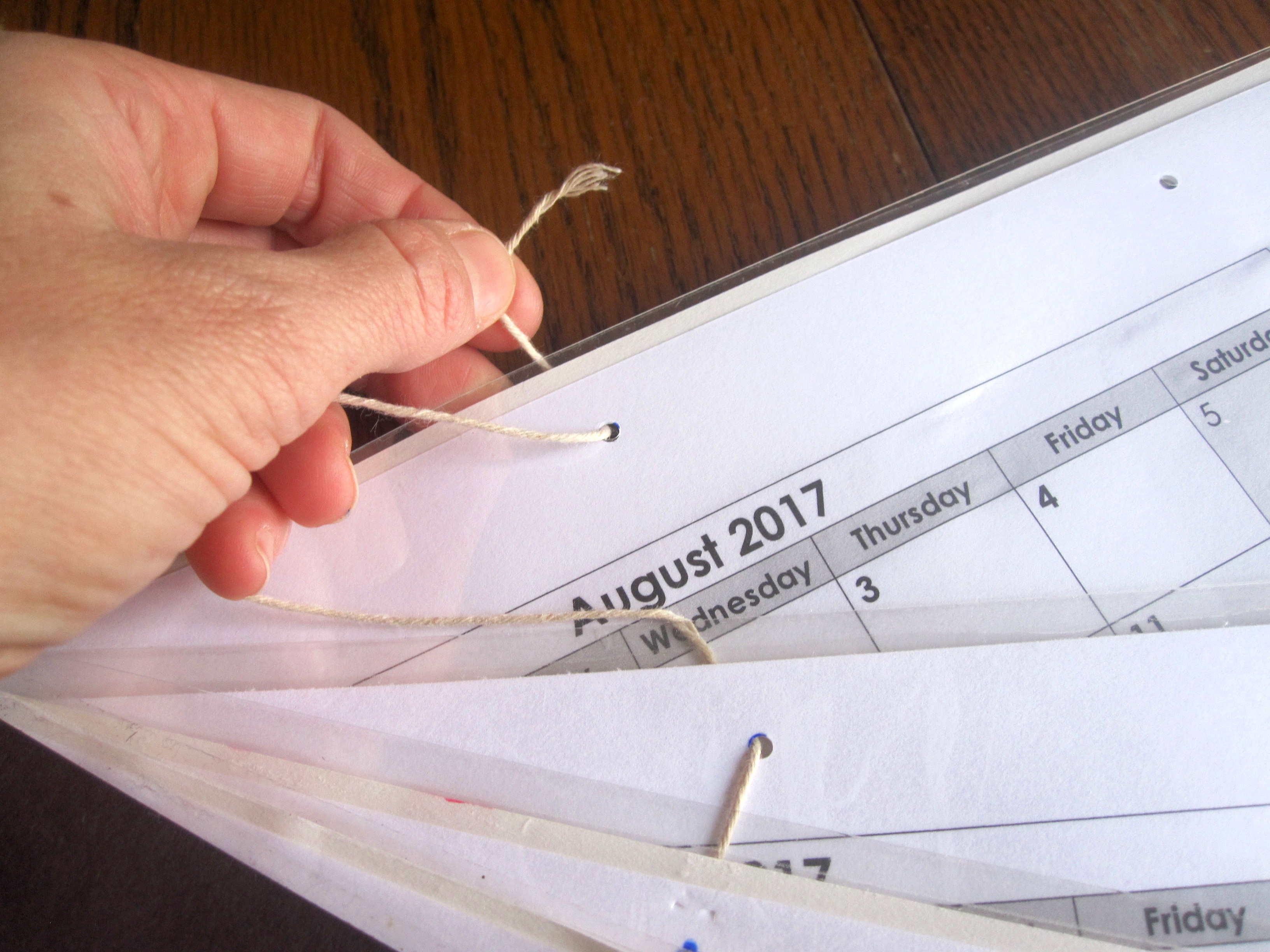 Then, using string or thin twine, run a length through each of the three holes and tie it up like you would a book (it should open from the right side). That’s it! You’ll have a fun keepsake that will hang around for an entire year.