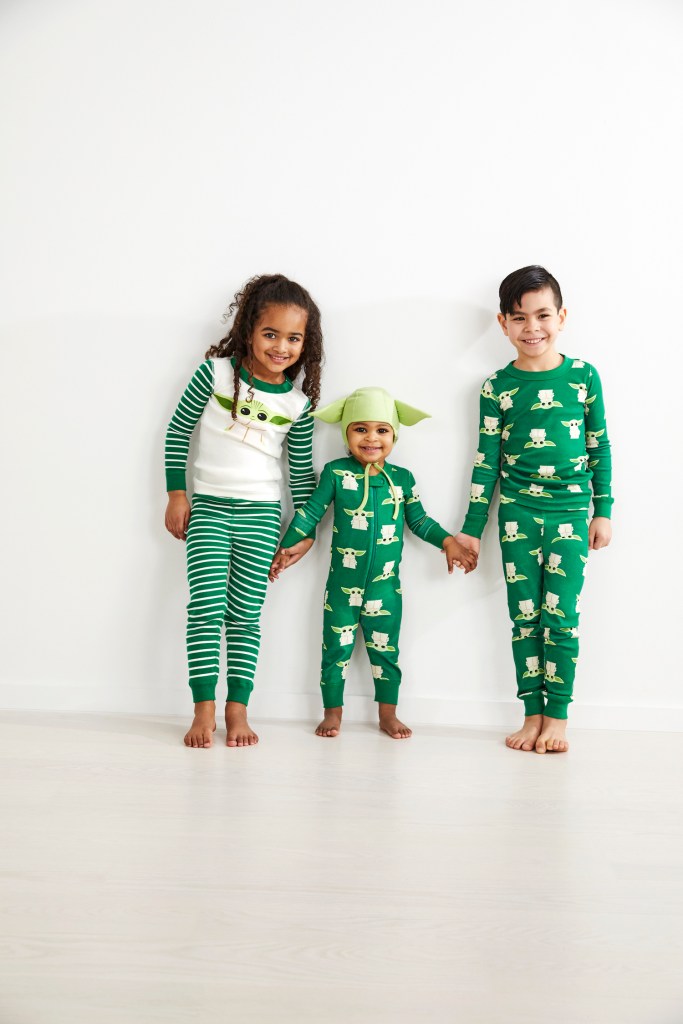 The gender-neutral PJ’s include one set with green and white striped pants and coordinating baseball style shirt with striped arms. The Child is stretched across the top in an adorable pose. The other set is an all-green design with a pattern of baby Yodas in alternating poses.