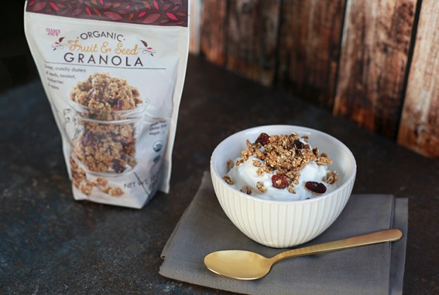 For this granola option, Trader Joe’s decided to think outside the cereal box. Instead of relying on oats, which are a granola staple, this version is heavy on sunflower, sesame, flax, chia, and hemp seeds as well as coconut, dried cranberries, and raisins. In addition to being organic, it’s also grain and gluten-free, and vegan. Grab these clusters by the handful, or top yogurt or oatmeal for energy that will get you to lunch. TJ’s also recommends it in trail mix or even on a salad!