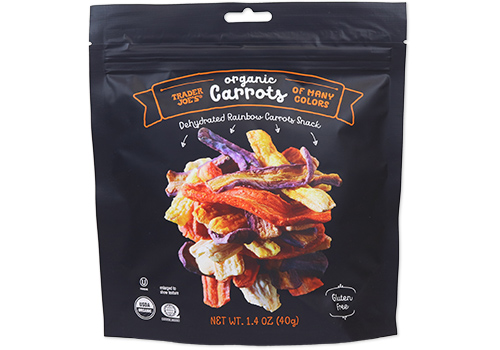 White, purple, yellow & orange carrots are cut, peeled, and dehydrated to bring us this crisp snack that's topped with sea salt. The gluten-free, two ingredients snack is packed with fiber and protein and tastes great with TJ's Spinach & Kale Greek Yogurt Dip.
