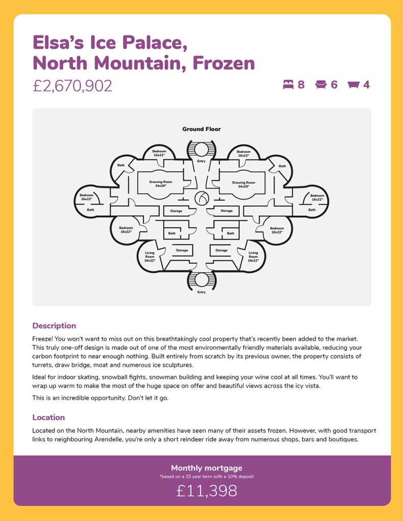 Money went on to calculate monthly mortgage costs based on 10 percent down over a 25 year loan. Elsa’s palace? That will set you back nearly $15,000 a month!