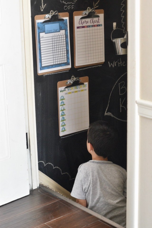 A family command center doesn't have to take up space in the kitchen, laundry room or mud room. We love that Jaclyn of Coffee, Pancakes, and Dreams used a wall that leads to the basement to work as her family's command center. With chalkboard paint, clipboards to hold chore charts and a shiny envelope awaiting loose papers, the command center put things in their place. Check out the step-by-step on Jaclyn's blog and as a bonus, get a set of free printable chore charts.
