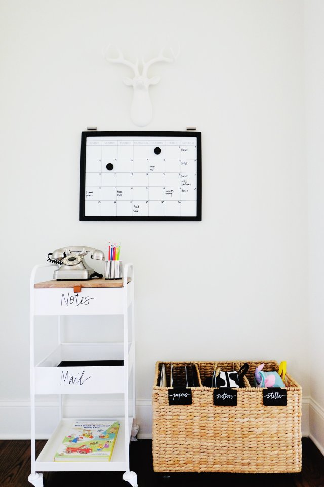 The brilliant organizational wizards at The Home Edit put together this modern simple command center that you can fit just about anywhere. A rolling cart is reimagined as a family catch-all while a whiteboard calendar tracks important dates and a rolling wicker basket makes a perfect drop zone for loose papers and preschool backpacks. Check out The Home Edit's tips to create your own command center.