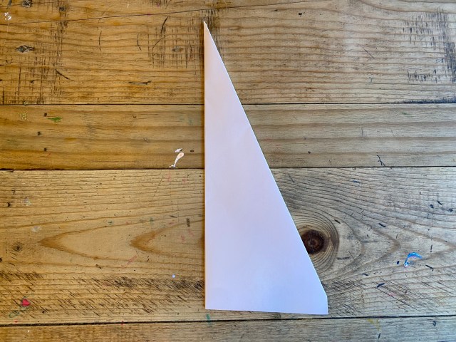 Fold the right side into the center crease again, being careful to keep the point of your airplane sharp. You should end up with a long triangle, with one side of the triangle running just along the center crease.