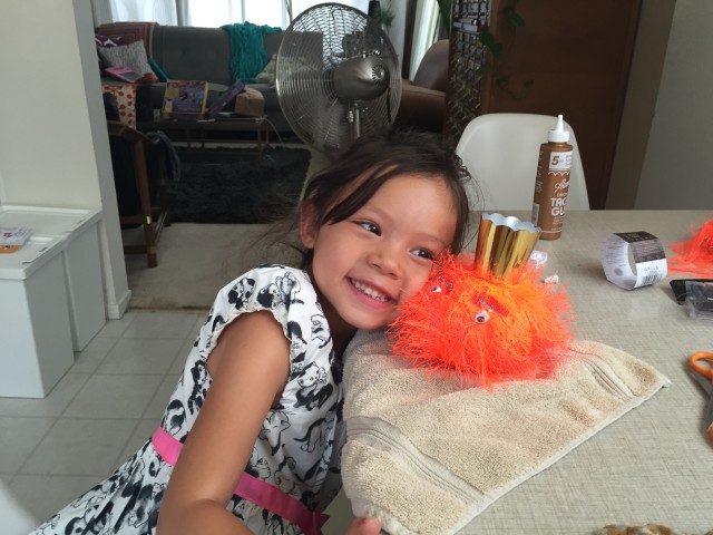 Step 6: Once your pet rock is covered in fun fur yarn add a bit of glue to its head. Add your gold crown.