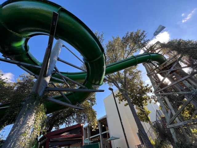 - Two waterslides and an indoor/outdoor pool – The first thing you’ll see when you get to the pool is the serpentine waterslide that curls high above it. There’s also a smaller, enclosed slide in the “indoor” section of the pool (a space that’s covered by a roof but is still, actually, outside). The best part? While your kids play, you can order food and drinks to be delivered to you poolside. Hello, vacation!
