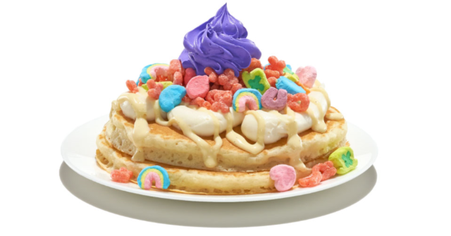 Fruity Lucky Charms Pancakes: Buttermilk pancakes with cereal milk mousse, vanilla sauce, Fruity Lucky Charms cereal, and sweet purple whipped icing