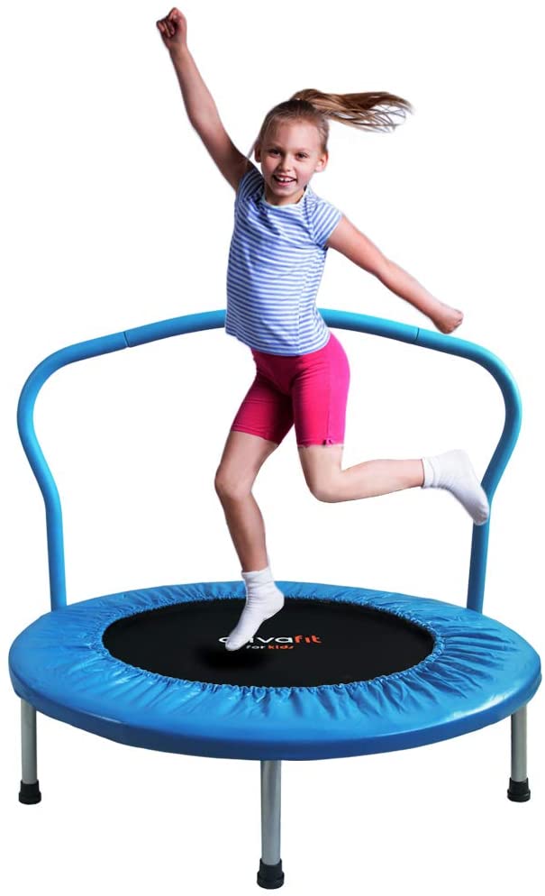 We love this option because of its low price tag and easy of storage. The handle of the trampoline provides stability for little jumpers and can be folded down when you want to store it away. Plop this one in front of the TV and have them jump while watching their favorite show!