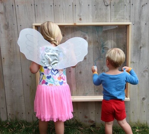Thinking beyond dry erase and chalkboards, All the Little Lights crafted her daughter's easel out of plexiglass. The attached paint palette is made from a plastic vegetable tray, great for separating paint colors. Easy to wash and reuse, it's the perfect outdoor canvas for artists of all ages.