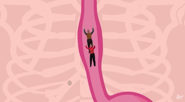 “Clap your hands and stomp your feet/ Give me something good to eat,” Perry sings in the hyper-colored video featuring the unforgettable chorus, “Yum yum, nom nom, toot toot, poop!” Kimmel takes it from there, singing about what happens after the food hits your tongue. “First the food goes in your mouth/ Then it starts to travel south,” he sings, and the music video rises to the creative challenge with the pair floating down a cartoon esophagus into a stomach.