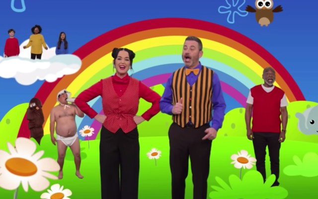 “Clap your hands and stomp your feet/ Give me something good to eat,” Perry sings in the hyper-colored video featuring the unforgettable chorus, “Yum yum, nom nom, toot toot, poop!” Kimmel takes it from there, singing about what happens after the food hits your tongue. “First the food goes in your mouth/ Then it starts to travel south,” he sings, and the music video rises to the creative challenge with the pair floating down a cartoon esophagus into a stomach.