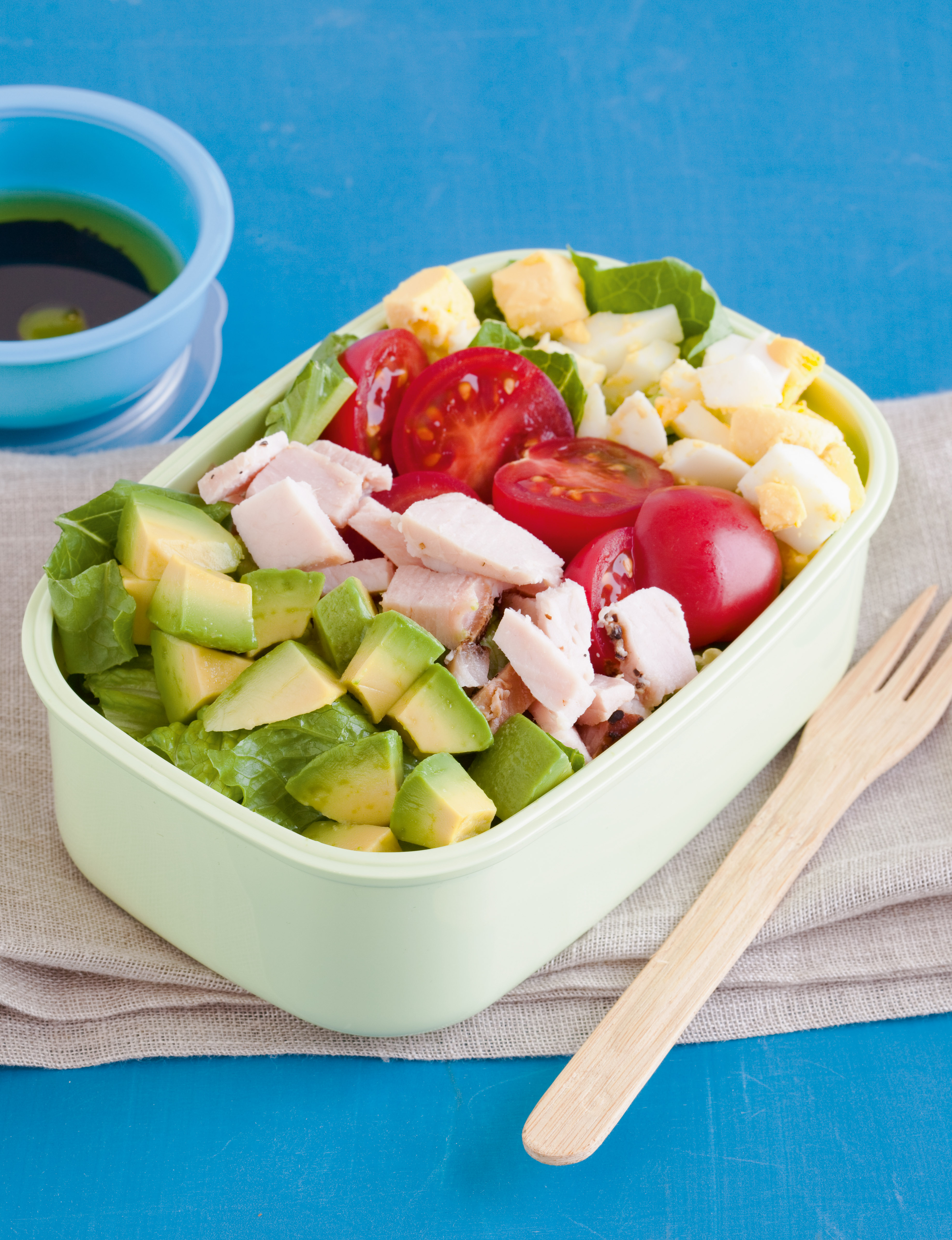 1. Divide the lettuce between two large containers. In each container, arrange half the tomato, avocado, turkey, eggs, and blue cheese (if using) in rows on top of the lettuce.