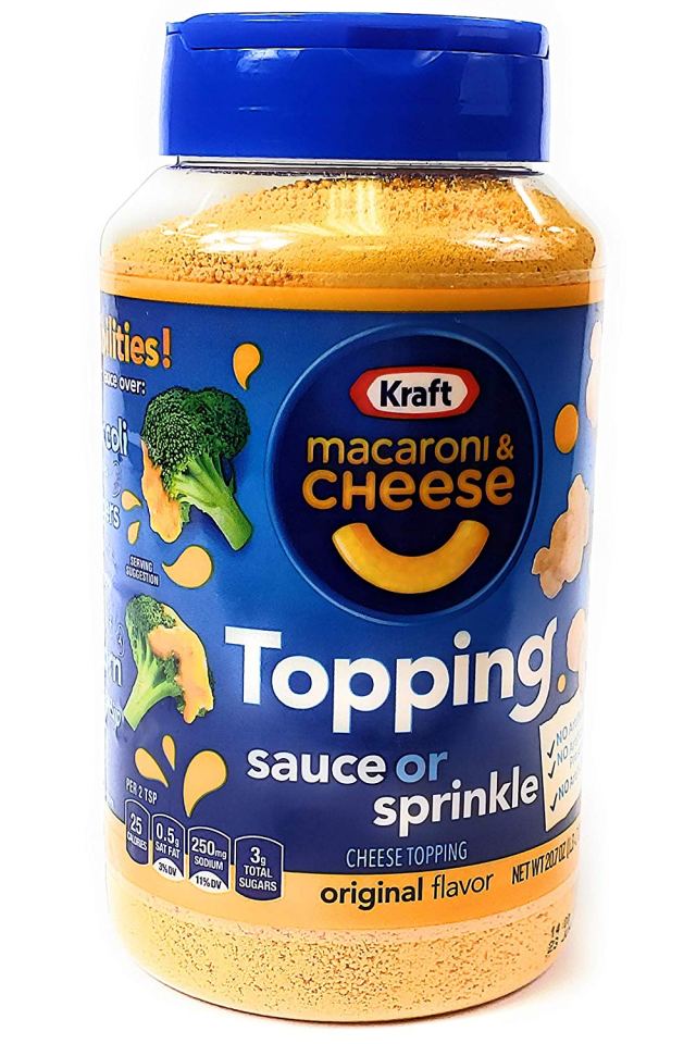 The only tricky part is tracking some down. The 20-ounce shaker of Kraft Macaroni and Cheese Topping Sauce or Sprinkle is currently available at east coast based wholesale club, BJ’s for $6.99.