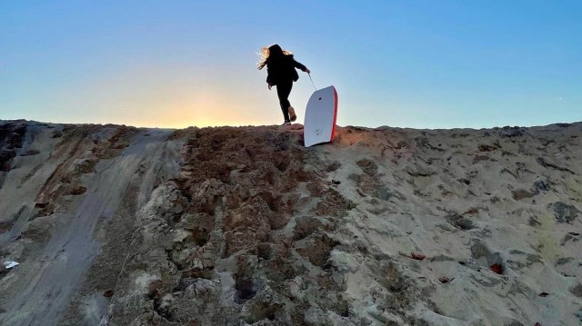 Just south of the Venice Beach Pier is one of the most popular sand sledding spots on the coast. The Venice berm stretches from the pier all along the length of the south parking lot, so despite being a hotspot, there's always plenty of room for everyone. These slopes are usually the biggest of the berms on the coast, making them the go-to spot for young sledders (and grown-ups) looking for the best thrill ride. Late Dec. or early Jan. is usually the best time to visit, as the sand has gotten packed down, making for a smoother, faster ride.