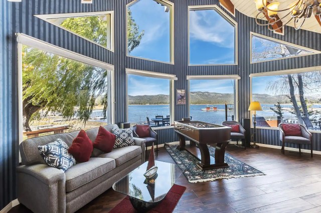 Vaulted wood ceilings? Check! Bunk beds? Check! Waterfront location with a dock to park your kayaks, canoes, or other water vehicles? Yes, yes, yes! This Big Bear cabin has everything you’d want in a summer getaway spot. Relax and take in the view through the floor-to-ceiling picture windows, or step onto the outside deck to enjoy unobstructed lake views while you barbecue beneath the stars (Hint: You’ve got a perfect view of the Fourth of July fireworks from here!). There’s also a grassy yard that leads to the waterfront, where there’s a dock free for guests’ use (boat/kayak rentals are available from shops throughout Big Bear, and these can be delivered to the home).