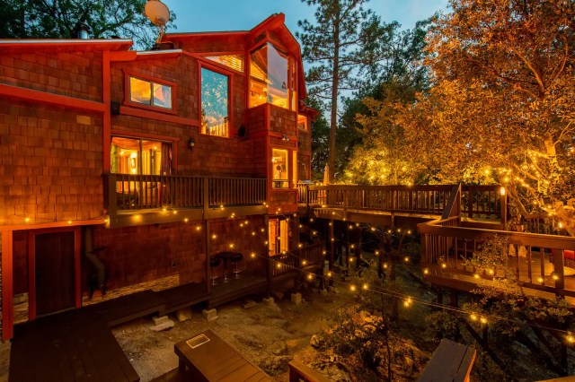 Nestled amid the Alpine forest of Idyllwild-Pine Cove, about 2 hours from Los Angeles, this mystical abode is a dream come true for anyone who is into fairies and magic. Designed as a creative space—and, by the looks of its Instagram page, popular with yogis and artists—the bohemian three-story cabin has enough enchanting nooks and crannies to keep kids endlessly exploring. The home has a movie room, a library, a yoga studio (renting this costs extra), and five colorful bedrooms. Decorative tree branches lace their way around spiral staircases, and cozy treetop-level window nooks will make a birdwatcher out of anyone who stops to sit. Outside, a network of wooden bridges and platforms crisscross the exterior, leading the way through the trees to three fire pits, a sauna, a jacuzzi, and numerous outdoor sitting areas.